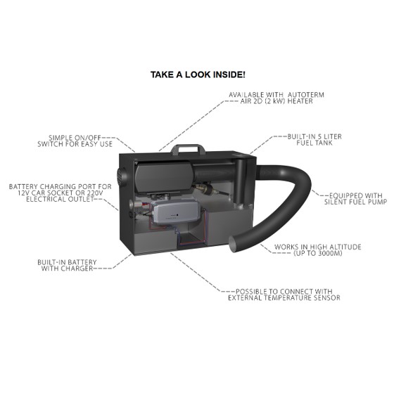 Autoterm Travel Box 2.0 er markedets stærkeste bærbare dieselvarmer designet til alsidighed og mobilitet. Den har en indbygget brændstoftank og 22Ah batteri, hvilket eliminerer behovet for installation.... Læs mere