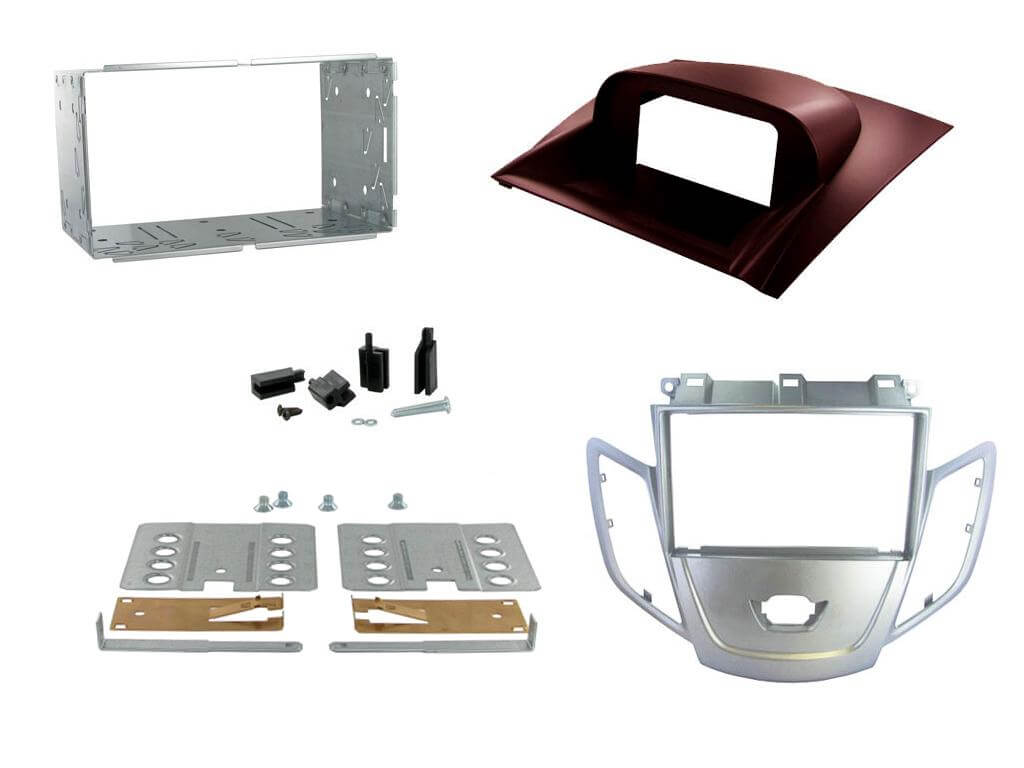 Ford Double Din Fascia Plate. Silver Fascia With Red Display Surround, Display Surround Mounting Pegs. Fascia Requires OEM Ford Hazard/Door Lock Switch – Part No. 1519127