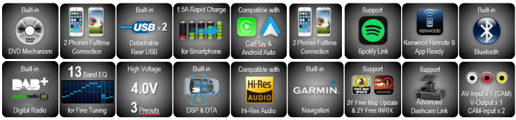 De fascinerende funktioner indeholder også en digital radio tuner, der muliggør krystalklar lyd og fejlfri modtagelse af mange DAB-stationer. Med seamless Blending funktion, viser Kenwood absolut teknologisk innovation: Den sofistikerede buffer teknologi sikrer uafbrudt DAB lytning uden irriterende afbrydelser, eller hvis der sker et skift mellem DAB og FM. Desuden kan Kenwood vise nye supplerende ydelser af digital radio: SLS Slideshow som er et parallel program for albumcover, logoer, eller infografik, mens den elektroniske programguide EPG viser transmissionens sekvens.