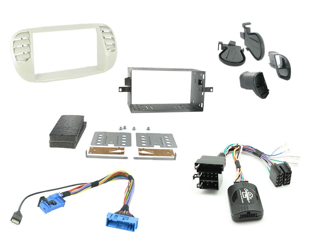 Fiat 500 Installation Kit. Supplied with Beige Double DIN Fascia, CAN-Bus Steering Wheel Control Interface, Blue And Me USB Socket Retention Cable & Universal Patchlead