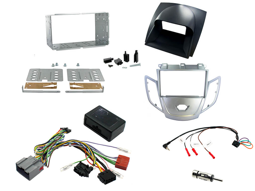 Ford Fiesta Installation Kit. Supplied With Silver Double DIN Fascia Kit And Grey Display Cover, CAN-Bus Steering Wheel Control Interface, Antenna Adapter & Universal Patchlead *Note – Fascia Requires OEM Ford Hazard/Door Lock Switch – Part No. 1519127