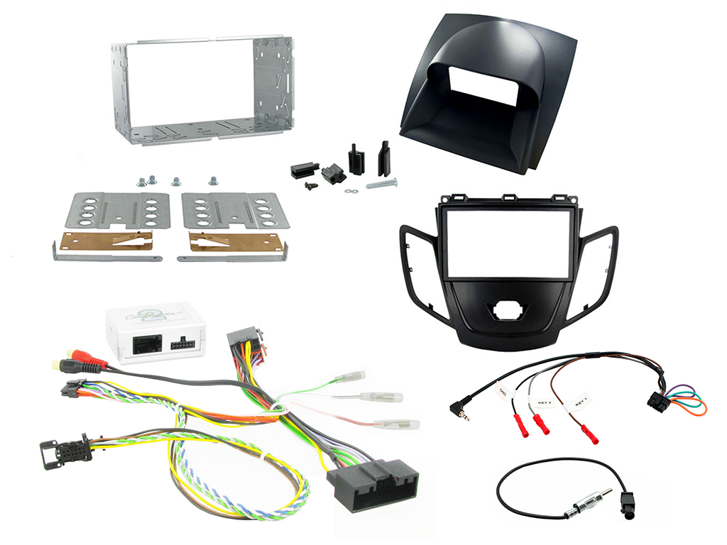 Ford Fiesta Installation Kit. Supplied With Black Double DIN Fascia Kit With Grey Display Cover, CAN-Bus Steering Wheel Control Interface, Antenna Adapter & Universal Patchlead *Note – Fascia Requires OEM Ford Hazard/Door Lock Switch – Part No. 1519127
