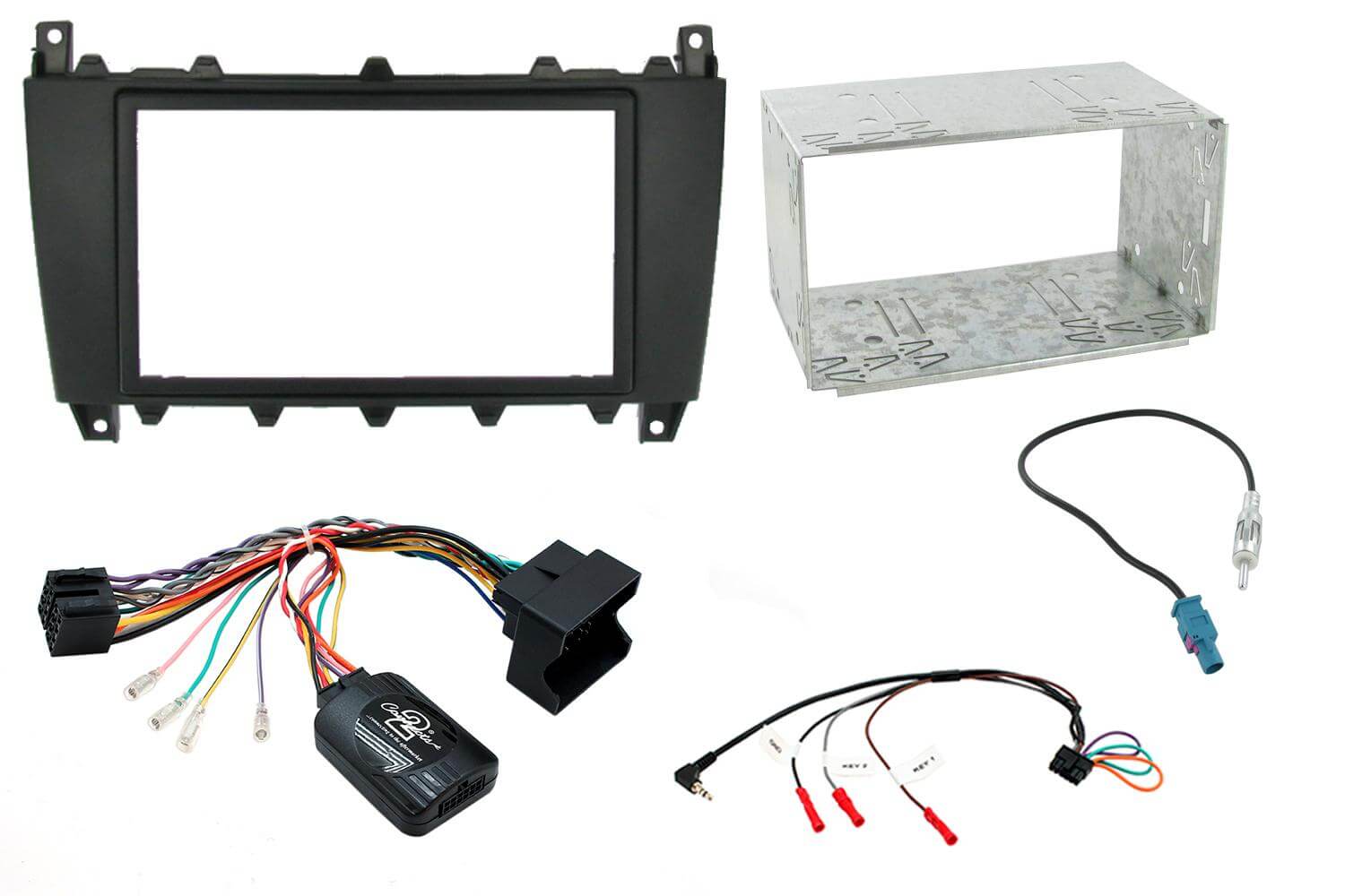 Mercedes C Class W203 Installation Kit. Supplied With Black Double DIN Fascia, CAN-Bus Steering Wheel Control Interface, FAKRA Antenna Adapter & Universal Patchlead