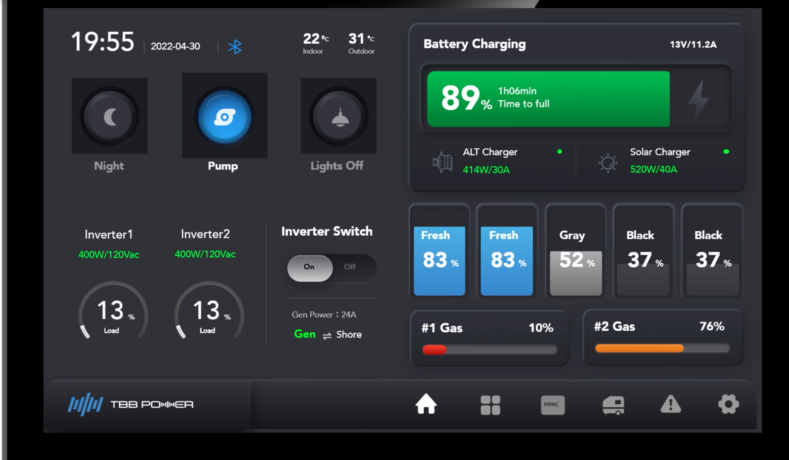 Alt dette kan forenes i TBB´s smarte monitor systemer, der alt efter monitor og tilbehør kan monitorere alt omkring strøm, indladning, forbrug, gas status, styring af kontakter, flådestyring via GPS og 4G opkobling.