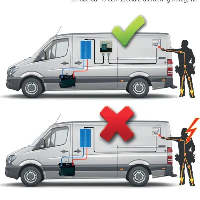 Køretøjer eller mobile enheder, der bruges i den professionelle sektor, er ofte udstyret med en DC-AC inverter eller en generator for at sikre, at de har 230 V AC overalt på stedet. Hvis denne vekselstrømsenhed er indbygget i køretøjet, og 230VAC tages uden for køretøjet / enheden, er der ingen sikker jord mere. Hvis der opstår en fejl, vil ingen beskyttelse gribe ind, og der opstår en meget usikker og farlig situation.